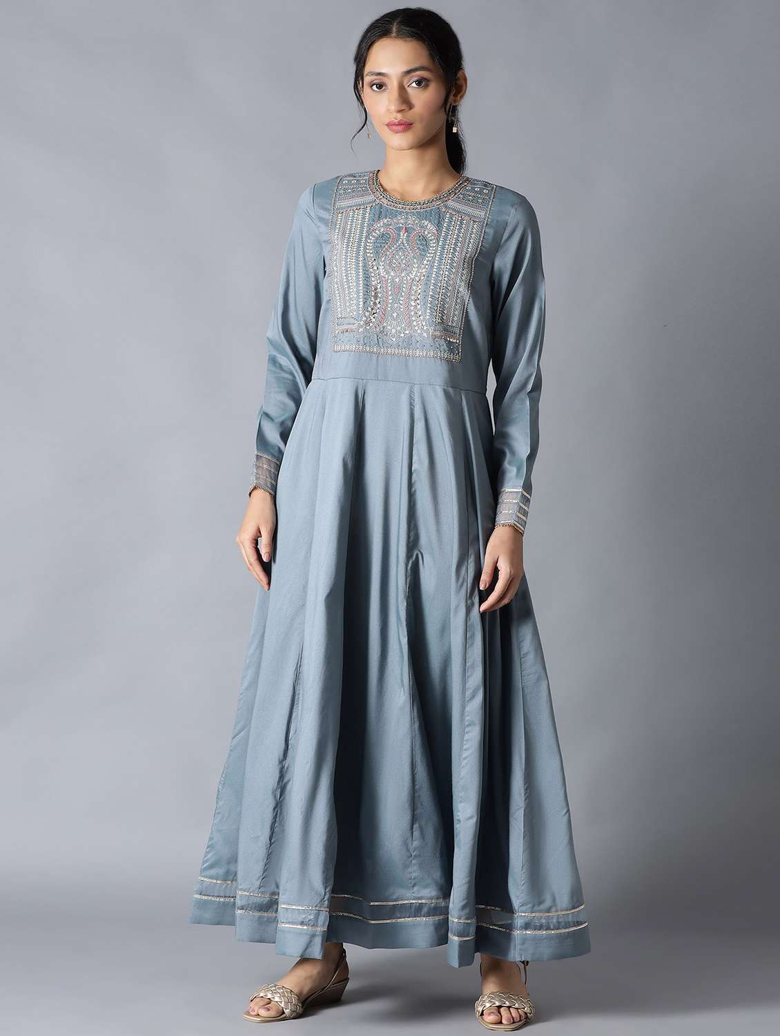 blue embroidered flared ethnic dress