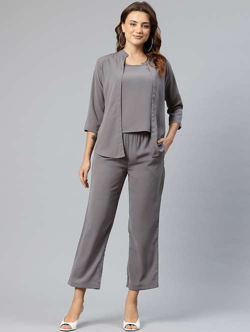 women grey solid jacket and trouser co-ord set