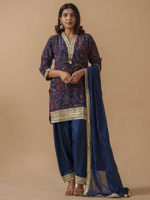 women printed three quarter sleeve kurta salwar with dupatta set