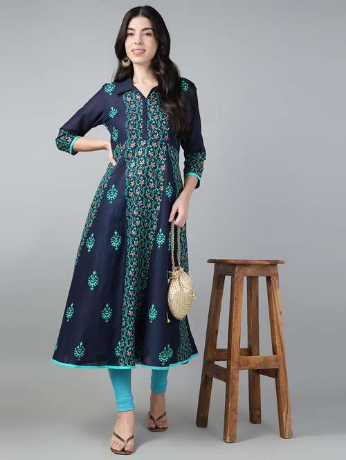 women blue mandarin neck a-line kurta