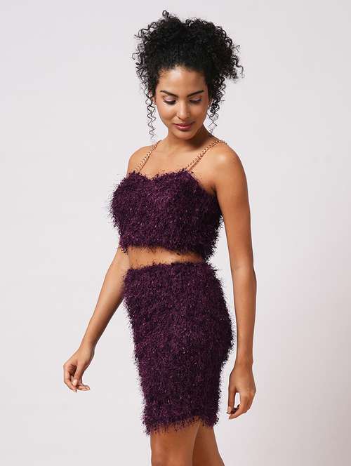 globus women burgundy sweetheart neck chain strap shoulder faux fur crop top with mini skirt party co-ord set