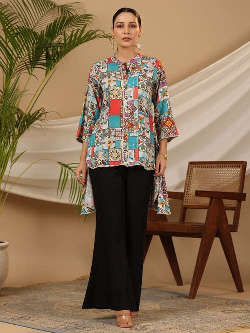 women printed three quarter sleeve high-low ethnic top