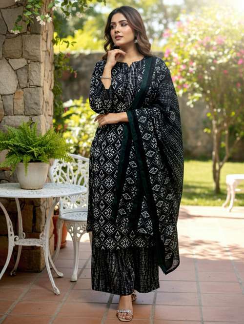women printed three quarter sleeve kurta palazzo with dupatta set