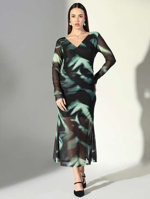 women abstract printed v neck bodycon dress