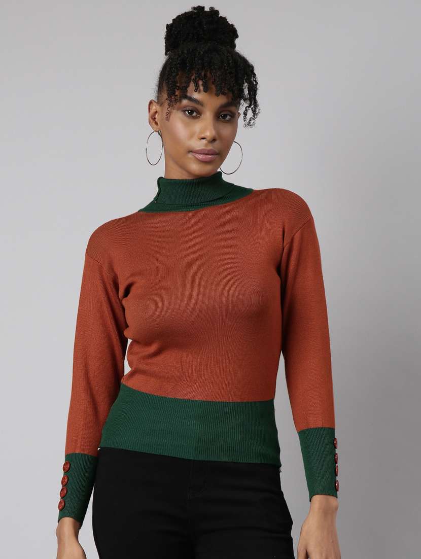 SHOWOFF Women's Long Sleeves Solid High Neck Brown Fitted Top