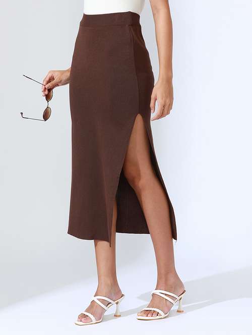 - » women brown solid high rise bodycon skirt