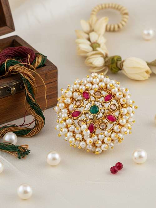Elevate your festive and everyday look with this exquisitely crafted floral design finger ring. Made from durable brass and finished with a radiant gold plating, this adjustable ring combines traditional artistry with modern wearability. The centerpiece features imitation ruby and emerald stones, beautifully complemented by freshwater pearl beads, arranged in a symmetrical floral motif. Perfect for weddings, parties, and cultural celebrations, this ring adds a touch of elegance and timeless charm to any outfit.