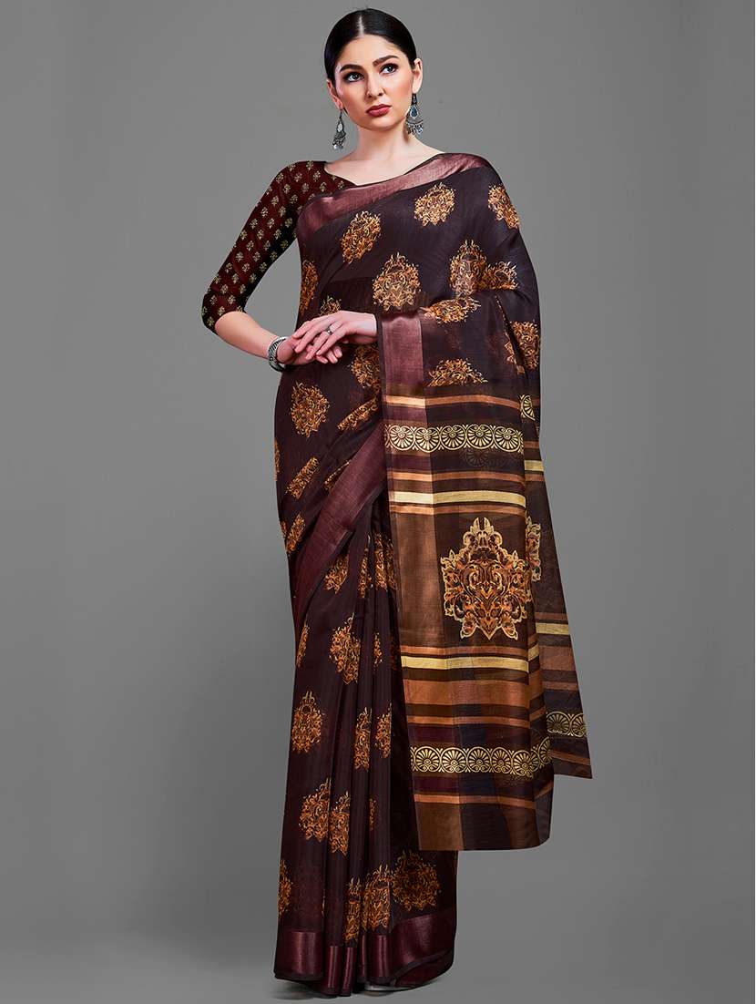 Brown Woven Batik Patterned Digital Printed Saree And Has A Zari Woven Border with Printed Blouse. The Model Is Wearing A Blouse From Our Stylist'S Collection, The Saree Comes With An Unstitched Blouse Piece