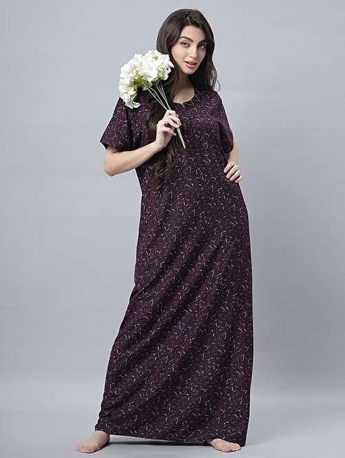Quira Women's Coffee Cotton Blend Printed Nighty - Half Sleeves, Round Neck, Long