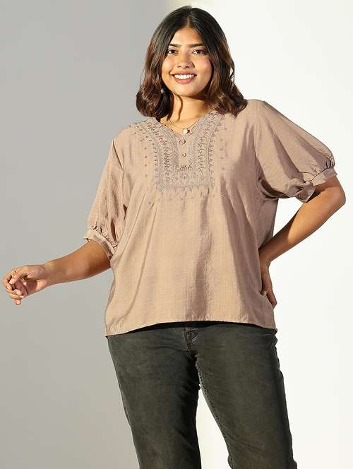 - » women brown embroidered puff sleeve top
