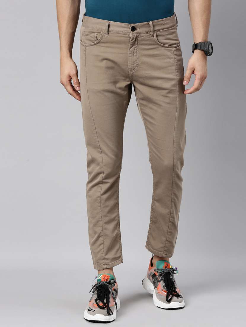 brown solid flat front casual trouser
