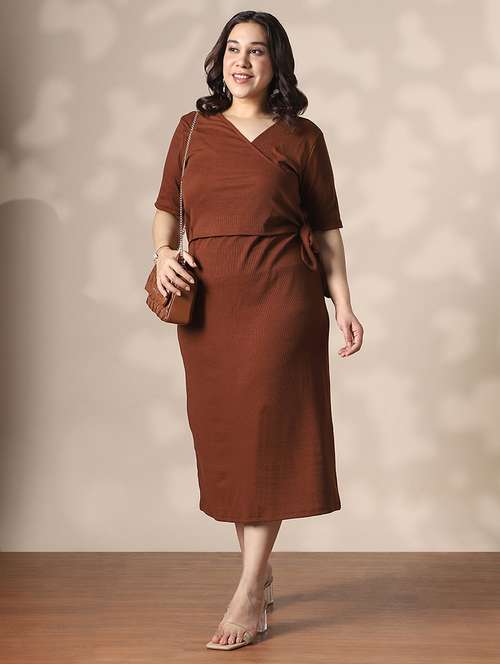 - » globus gloplus women brown wrap v-neck waist tie-ups ribbed plus size midi sheath dress