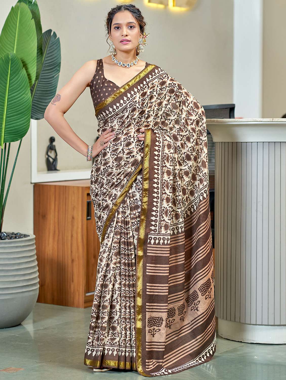 women brown printed saree with blouse