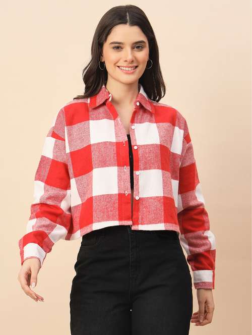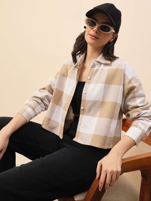- » women checkered long sleeve cropped shacket