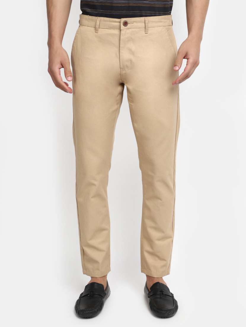 men solid cream cotton chinos regular fit casual trouser