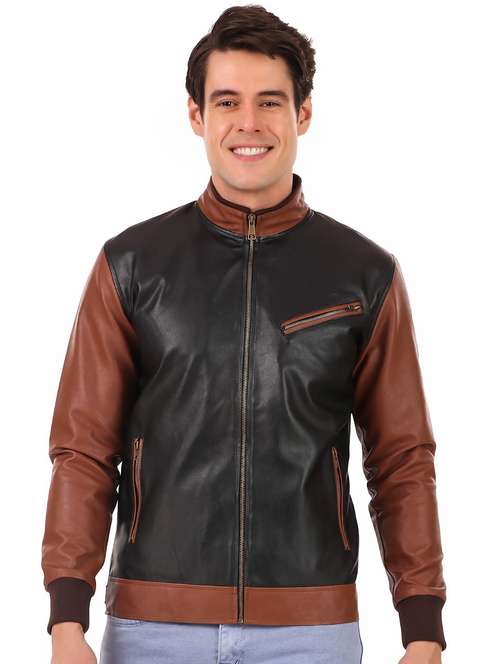 - » men color block long sleeved biker jacket