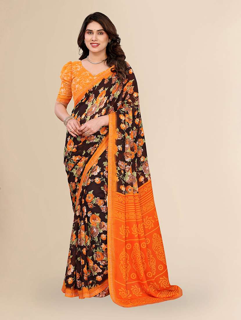 The saree features delicate floral prints enhanced with subtle embellishments that add a gentle sparkle, bringing a touch of sophistication to your daily ethnic style. The rich brown hue adds depth and versatility, making it suitable for casual outings, office wear, or informal gatherings. Pair it with a matching or contrasting blouse and minimal accessories for a polished and graceful ensemble.