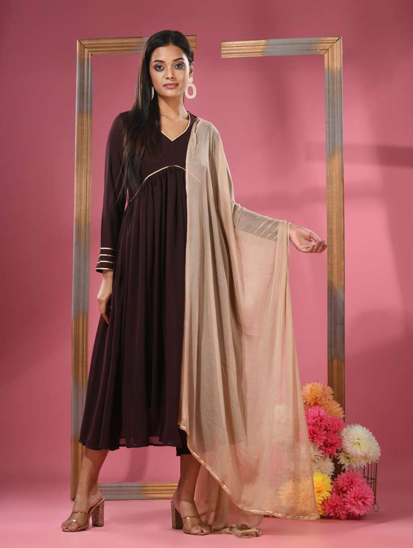 - Find gorgeous sets of ethnic wears in trending designs in brown colors suitable for casual wear of occasions.
