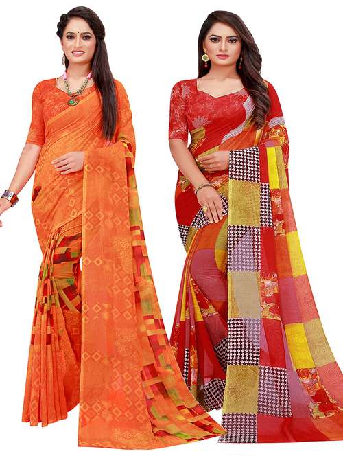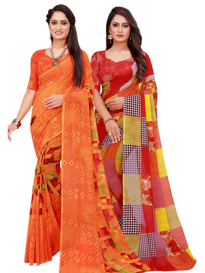 Be the cynosure of all eyes wearing this multi colored printed sarees from the house of Florence. Made of Georgette, this saree will keep you comfortable throughout the day. The fine Work enhances the visual appeal of this saree. each saree measures 5.5 m and it comes with a 0.80 m blouse piece.