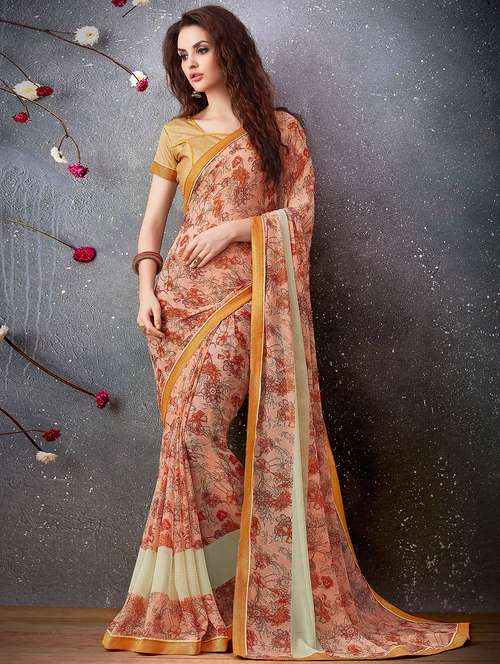 Shaily Retails look simple and sober stylish brown georgette printed saree. This beautiful casual saree is elegantly decorated with gorgeous prints and pattern that gives a perfect look to the outfit. This saree is an ideal for casual functions and social gathering. Saree comes along with matching fabric unstitched blouse piece. Saree Length:- 5.5 MTR, Saree Fabric:- Georgette, Blouse Fabric:- Banglori Silk, Blouse Length:- 0.80 MTR Note : All products of Shaily Retails comes under the copyright with trademark under Gujarat Commercial Tax.