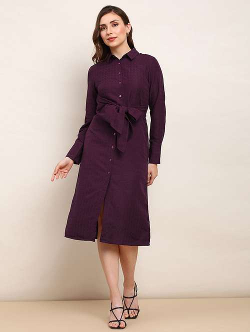 - » women brown collared neck cuffed sleeves self design waist tie-ups midi workwear shirt dress