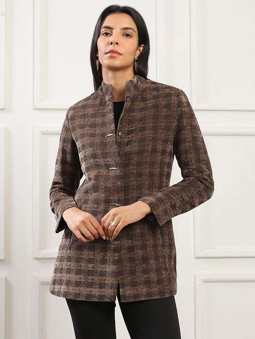 globus women camel brown mock collar long sleeves self checkered 2 pockets hip length winterwear overcoat
