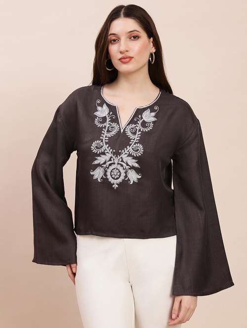 Add an elegant ethnic flair to your casual wardrobe with this brown embroidered V-neck top. Crafted from soft, lightweight polyester, it offers a comfortable and breathable fit ideal for all-day wear. The intricately embroidered floral motifs elevate the look, while the statement bell sleeves add graceful movement and a touch of sophistication. Finished in a regular fit with an opaque surface, this top blends simplicity and charm effortlessly.