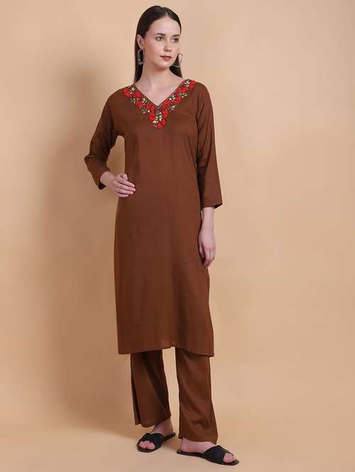 - » women brown v neck kurta pant set