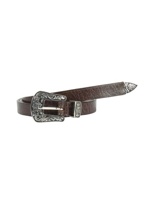 Amps up the simplest outfit with adding this western design cowboy three-piece buckle brown belt. Crafted with finest of the grainy textured genuine leather strap which ensures high quality and durability. Features western classic cowboy design buckle which is antique silver finish and nickel-free. Made in India with a high standard of quality and craftsmanship.