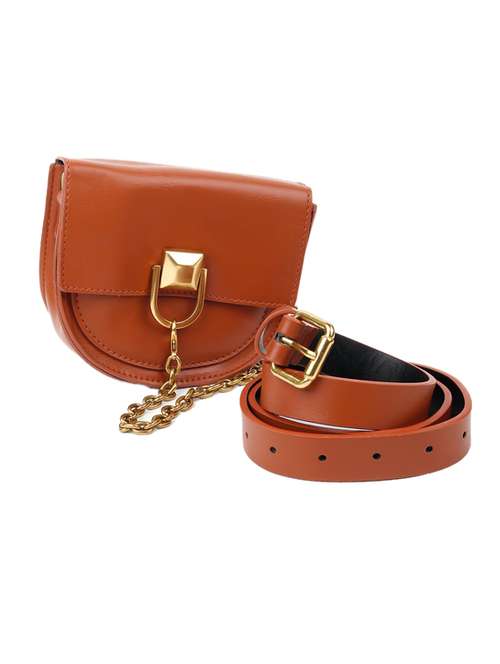 tan colored very versatile classic waist belt-bag with a golden chain