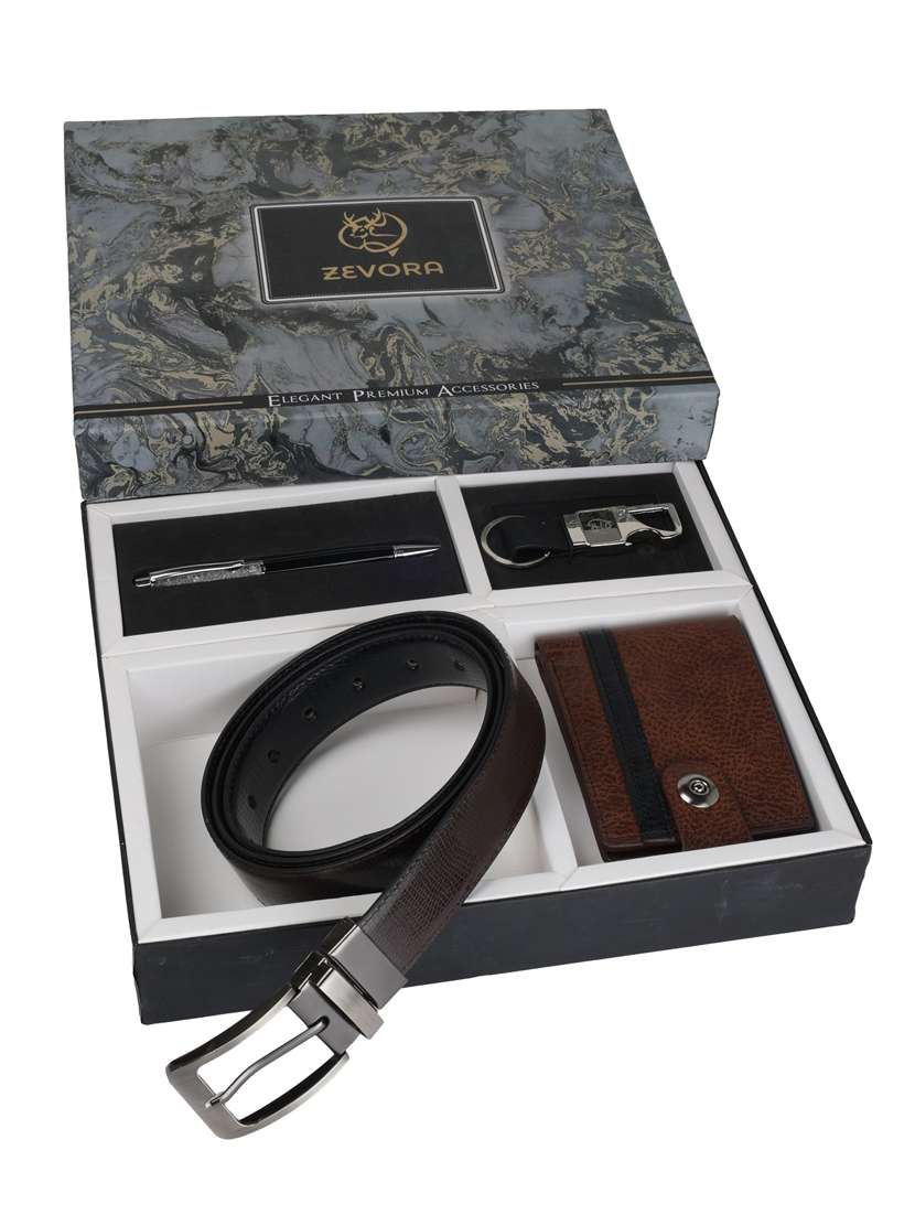 The Zevora Gift Hamper for Men is the ultimate combo gift set designed to impress. This pack of four includes a sleek leather belt, a stylish wallet, a practical keychain, and a sophisticated pen, making it a perfect choice for any occasion. Crafted with premium materials, the leather belt and wallet exude elegance and durability, ensuring long-lasting use. The keychain adds a touch of class and convenience, keeping keys organized. The pen, with its smooth writing experience, complements the set, making it ideal for professionals and daily use. Packaged in an elegant gift box, this set is perfect for birthdays, anniversaries, or any special celebration. Show your appreciation with the Zevora Gift Hamper for Men, a thoughtful and practical gift that combines style and functionality.