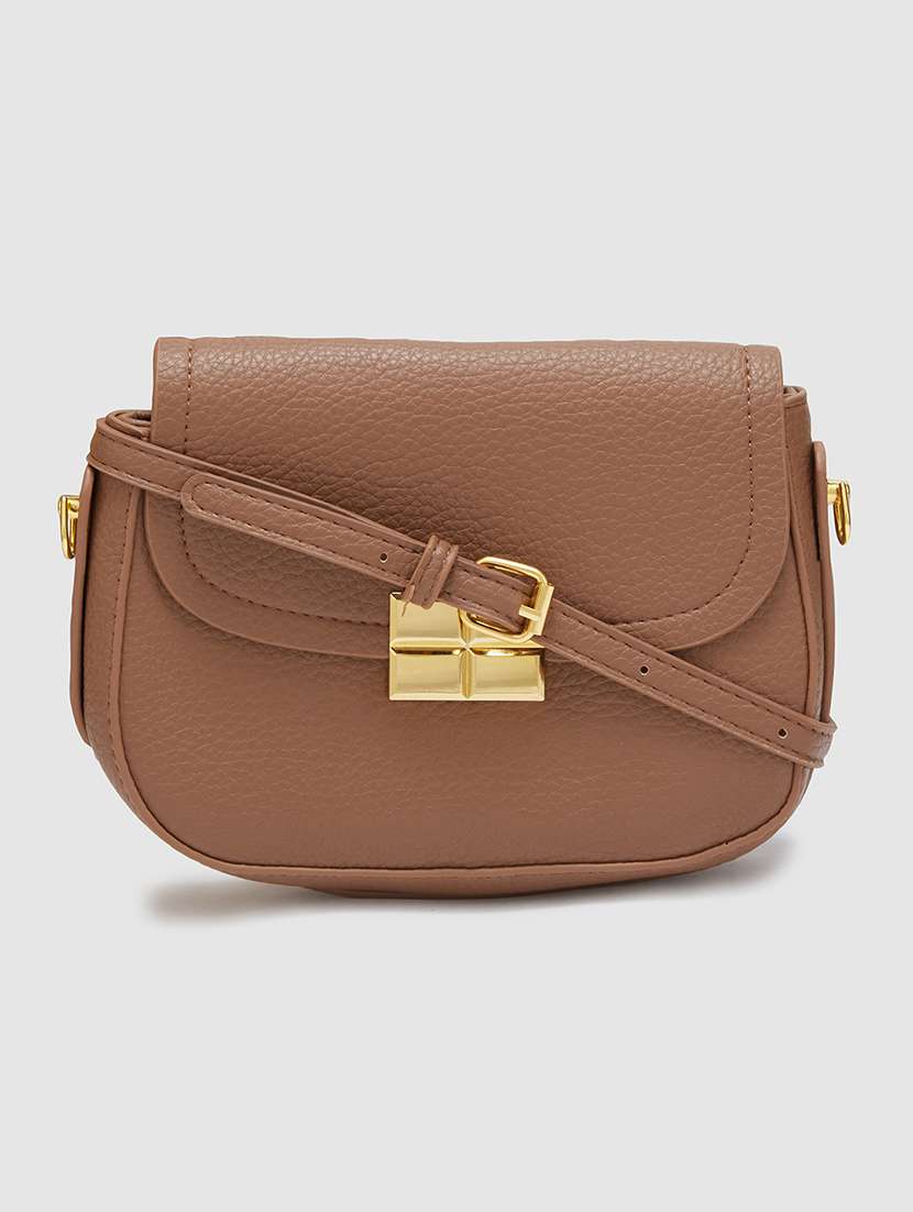 GLO by Globus has a range of fashionable & stylish crossbody for today’s woman. This brown coloured crossbody has a textured surface in a half-moon shape & a stylish metal closure, it has a detachable strap belt to carry across shoulder. Made in superior quality PU. Flaunt this smart & stylish crossbody with your smart casuals.
