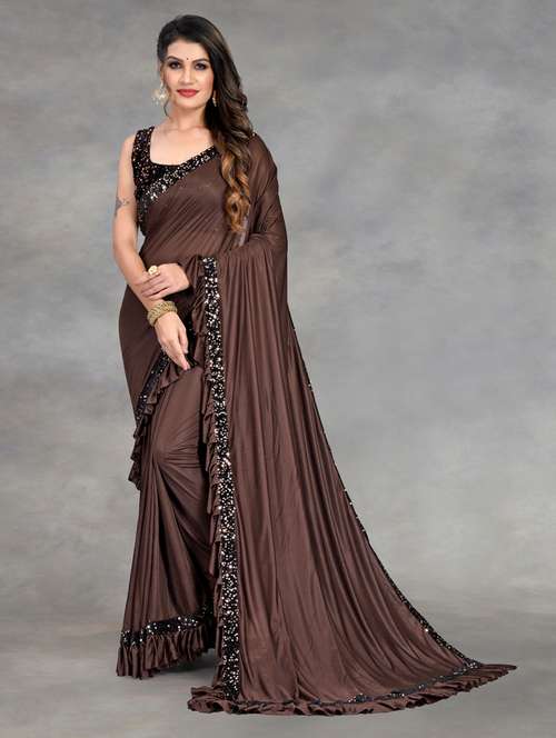 Fabric: Lycra, Work : Squence Embroidered, Saree Length of 5.25 meters in Coffee Color, The saree comes with a blouse piece 0.75 meter Velvet Squence Embroidered Work. It is unstitched and can be altered according to your fit and style that you require