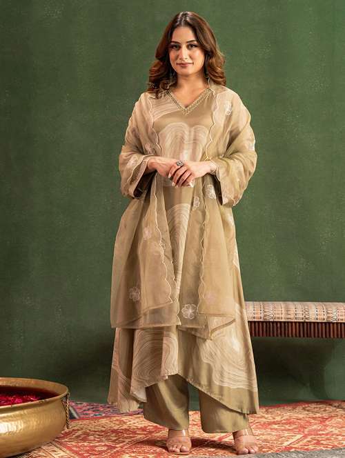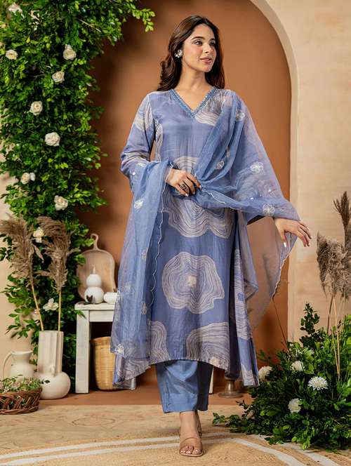 - Browse through the latest range of ethnic sets for women with tailored sleeve designs with embroidered works.