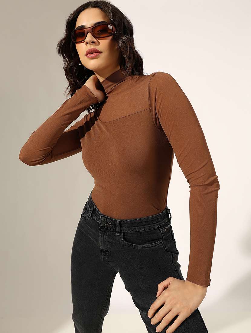 SHOWOFFFF Edition Women's Brown Turtleneck Mesh Yoke Top