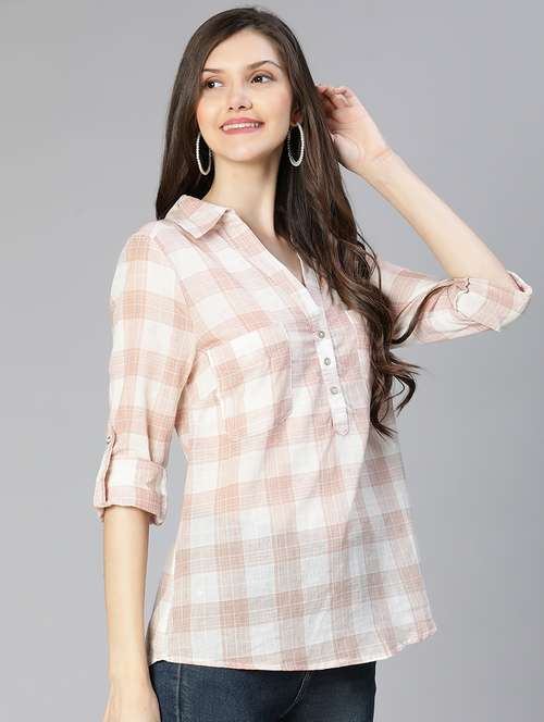 Bold checks for an elevated fashion statement, yes that’s the demand of every closet and for that, we have made Light brown check printed women's casual tops with organic cotton fabric. It features a comfortable fit, checks print all over, a regular open collar along with buttons, long roll-up sleeves, chest pockets, and length to the waist with a round hem. Style it with nice-looking pants or trousers for an easy, dizzy look and get yourself into a trendy zone with this new top of the season.