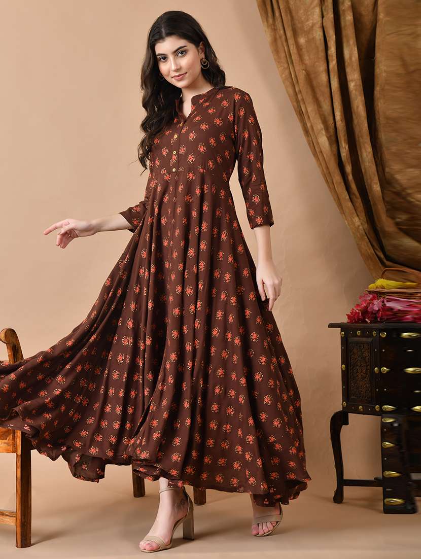 - » women brown three quarter sleeve flared ethnic dress