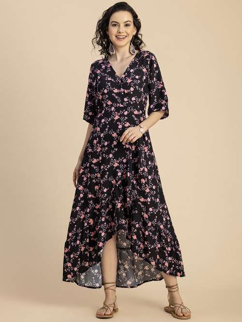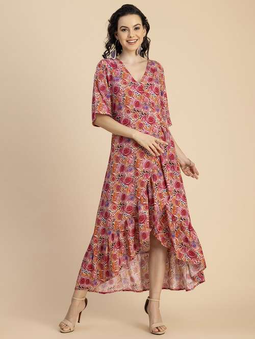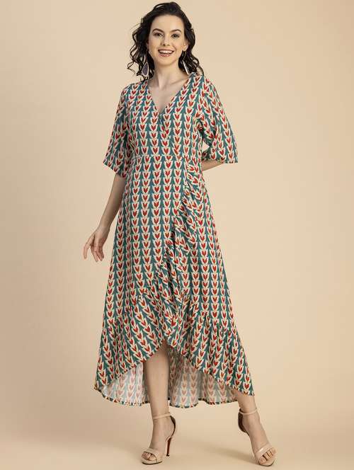 *Includes: This Clothing Consists Of 1 Dress (Any Accessories Worn By The Model Are Not For Sale)*Material: Viscose Rayon*Dress Length: 52 Inches (Approx.)*Model Stats: The Model In The Image Is 178 Cm Tall, And Bust 34\ Inches Is Wearing Size - (S) Small*Features: V-Neck, Wrap Style, Ruffle Hem, Elbow Sleeve, Long Maxi Length, And All Over Printed Pattern*Care: Medium Machine Wash, Warm Iron, Iron While Damp. (After Washing Do Not Dry The Fabric On High Heat And Do Not Dry Fully. Medium Heat Is Best And Removes Just Prior To Being Completely Dry)*Size Information: Please Refer To Our Size Chart Before Making The Purchase. If Your Size Is In Between Two Sizes, We Recommend That You Choose A Larger Size*Tags: Long Dress For Women, Ruffle Hem Asymmetrical Dress, Printed Maxi Dresses, V-Neck Dress, Printed Dresses For Women,