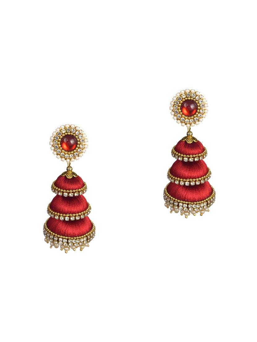 Long Three Step Loreal Silk Thread Jhumka Red Earrings
