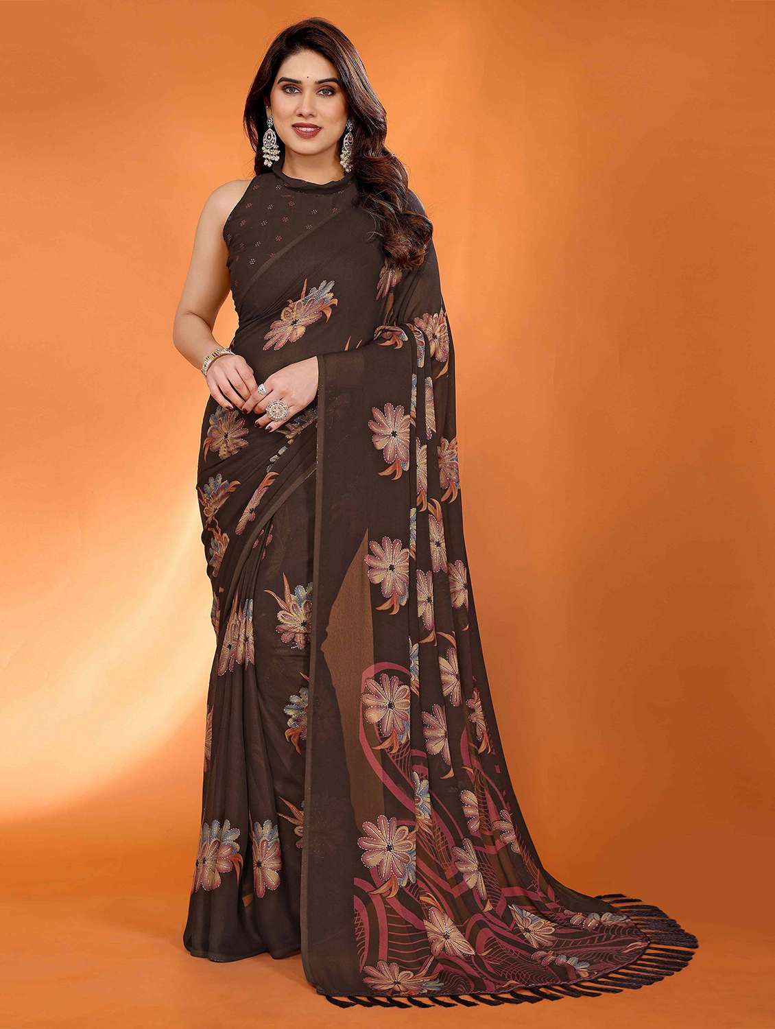 This elegant Brown saree, crafted from smooth satin fabric, features a graceful floral print enhanced with delicate zari woven charm. Its soft texture and fluid drape offer comfort along with a stylish appeal. The saree is paired with an unstitched satin blouse piece, giving you the freedom to design it as per your personal style. Perfect for casual outings, daily wear, and relaxed gatherings, this saree combines ease and elegance for a timeless look.