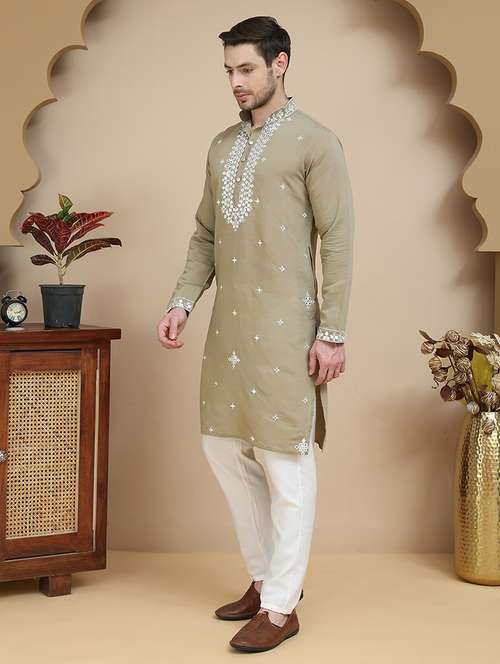 Brown Embroidered Mandarin collar Long, Regular sleeves Straight shape with regular style Thread work detail Knee length with straight hem Machine weave regular silk Blend