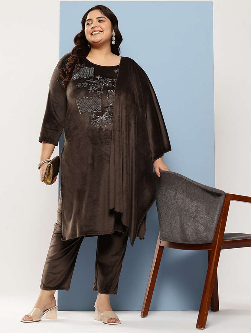 women plus size embellished three quarter sleeve kurta pant with dupatta set