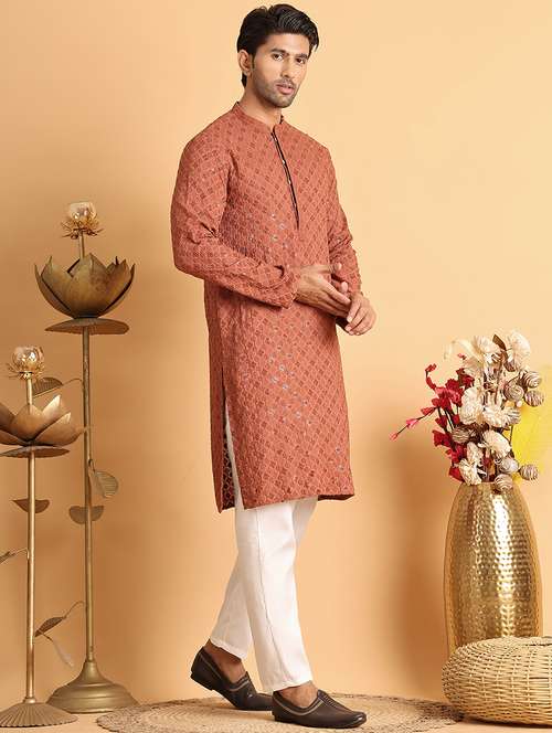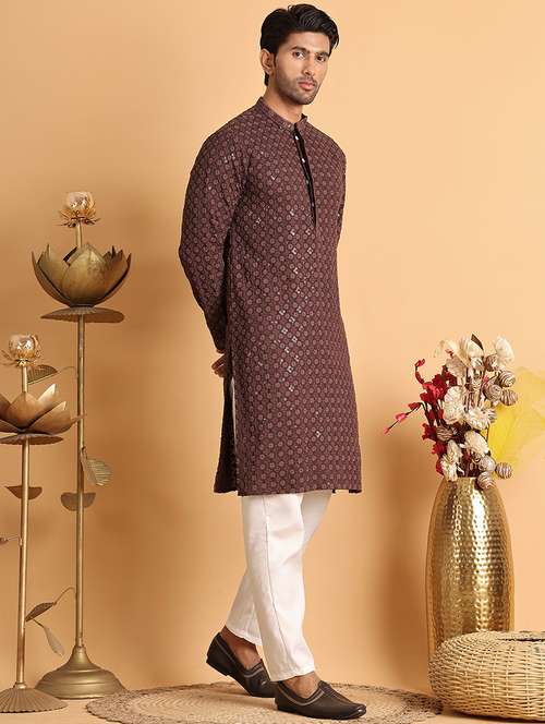 Coffee Brown Embroidered and Sequins kurtas, Coffee Brown straight knee length kurta, has a mandarin collar, long sleeves, straight hem.