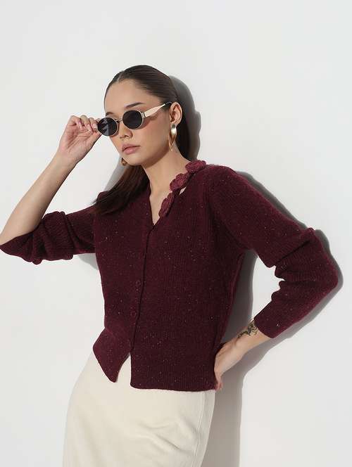 SHOWOFFFF Edition Women's Ribbed Burgundy V-Neck Embellished Knitted Top