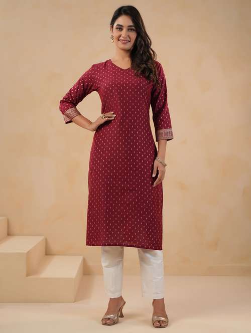 - Find gorgeous sets of ethnic wears in trending designs in maroon colors suitable for casual wear of occasions.