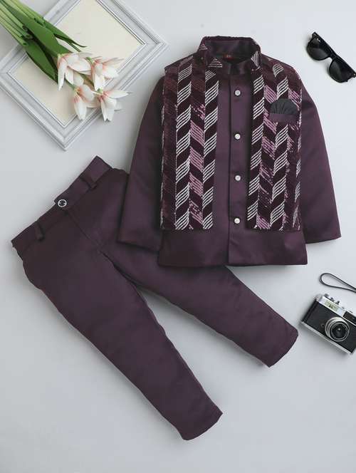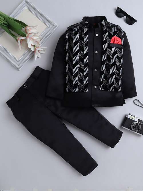 - » boys solid shirt and trouser with embellished wasitcoat set