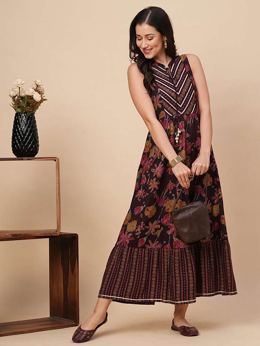 - » globus women burgundy allover floral printed mandarin neck gota patti a-line festive maxi dress