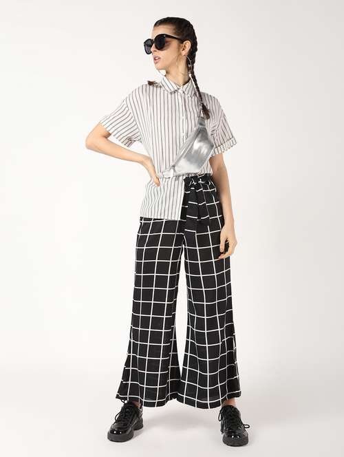 PepTrends Flared check white and black palazzo with fabric belt and attached loops. It has an elasticated waist.