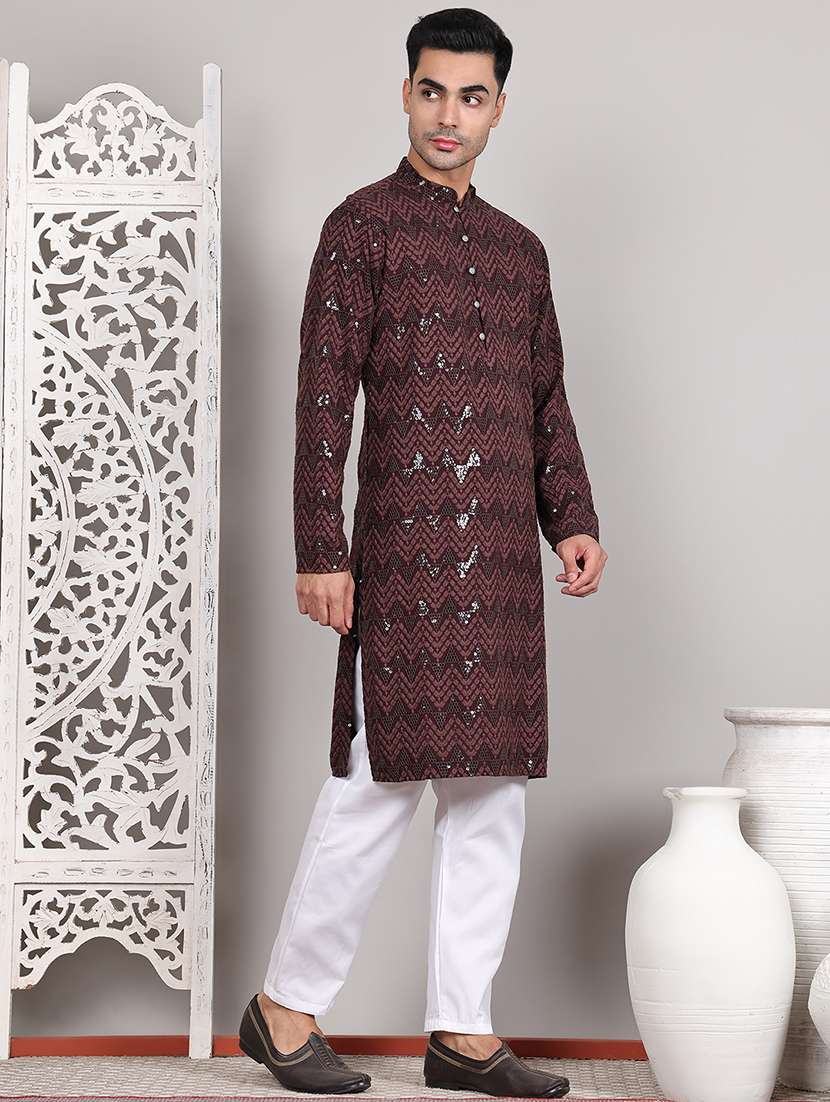 Coffee Brown Sequins & Embroidered Kurta Pyjama Set, Coffee Brown straight above knee kurta, has a mandarin collar, long sleeves, straight hem ,White solid Pyjama, drawstring closure