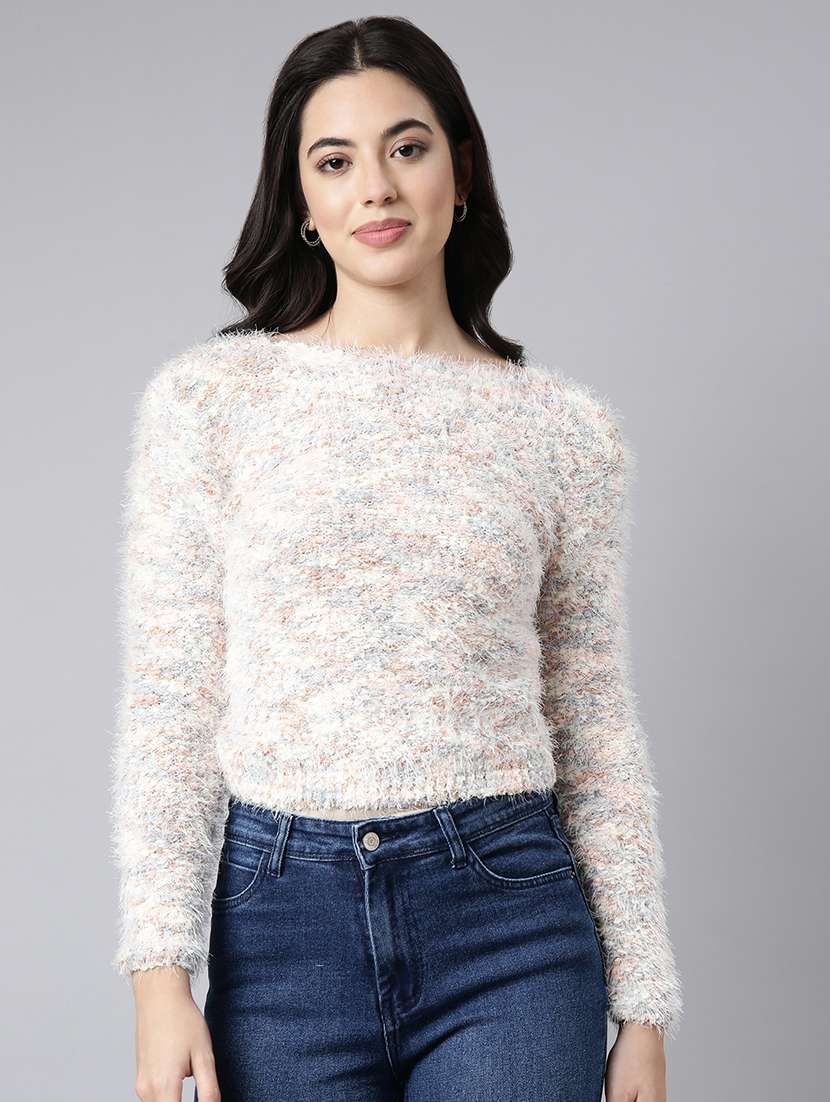 SHOWOFF Women's Long Sleeves Round Neck Self Design Cream Top